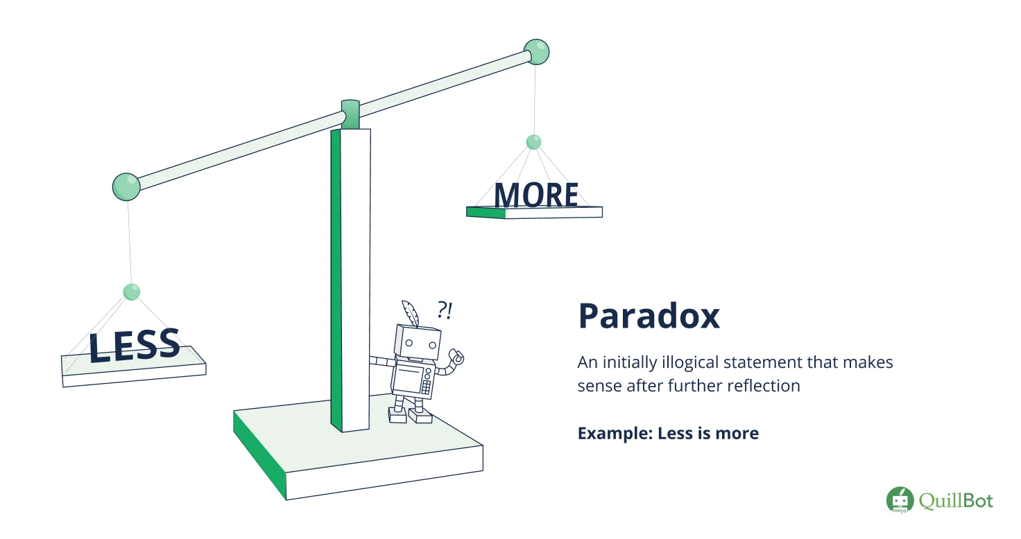 Paradox exampleA well-known paradox is the phrase “The only constant in life is change.” This may sound illogical because change and consistency are opposite concepts. However, this phrase encapsulates a deeper truth: that life is characterized by continual change.