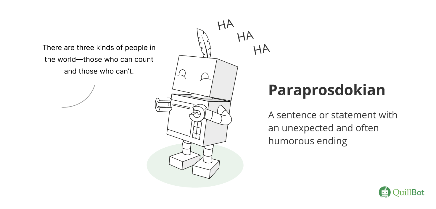 A paraprosdokian is a sentence or statement with an unexpected and often humorous ending. The surprising twist makes us think and reinterpret the entire phrase.
