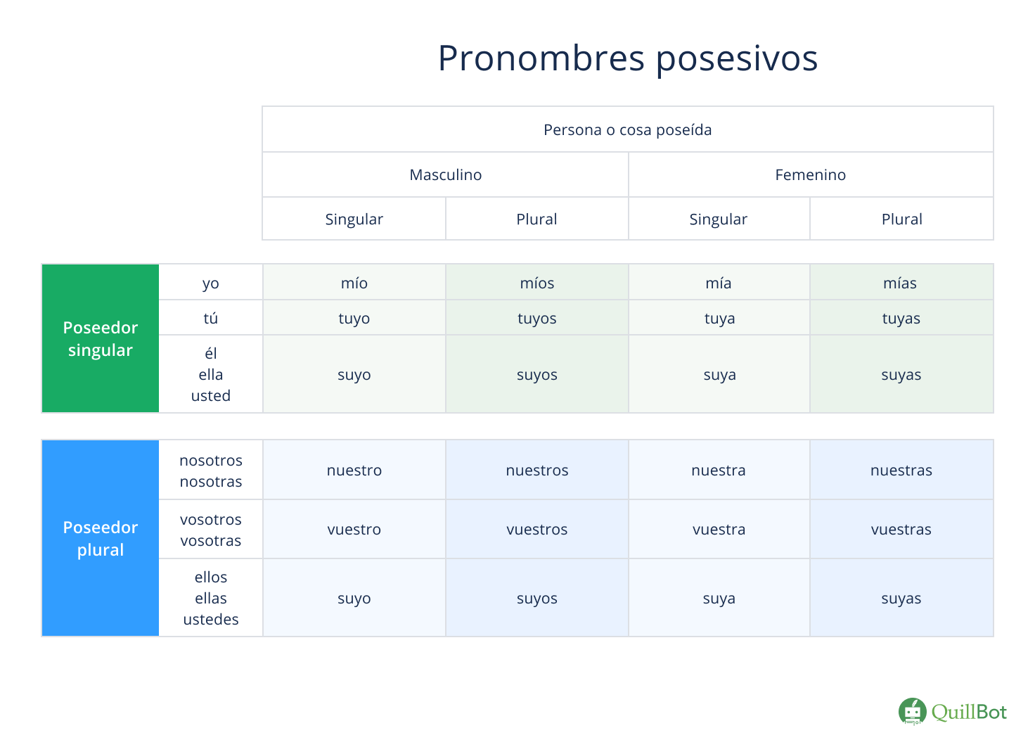 Los pronombres posesivos indican posesión o pertenencia y se refieren siempre a la persona poseedora.