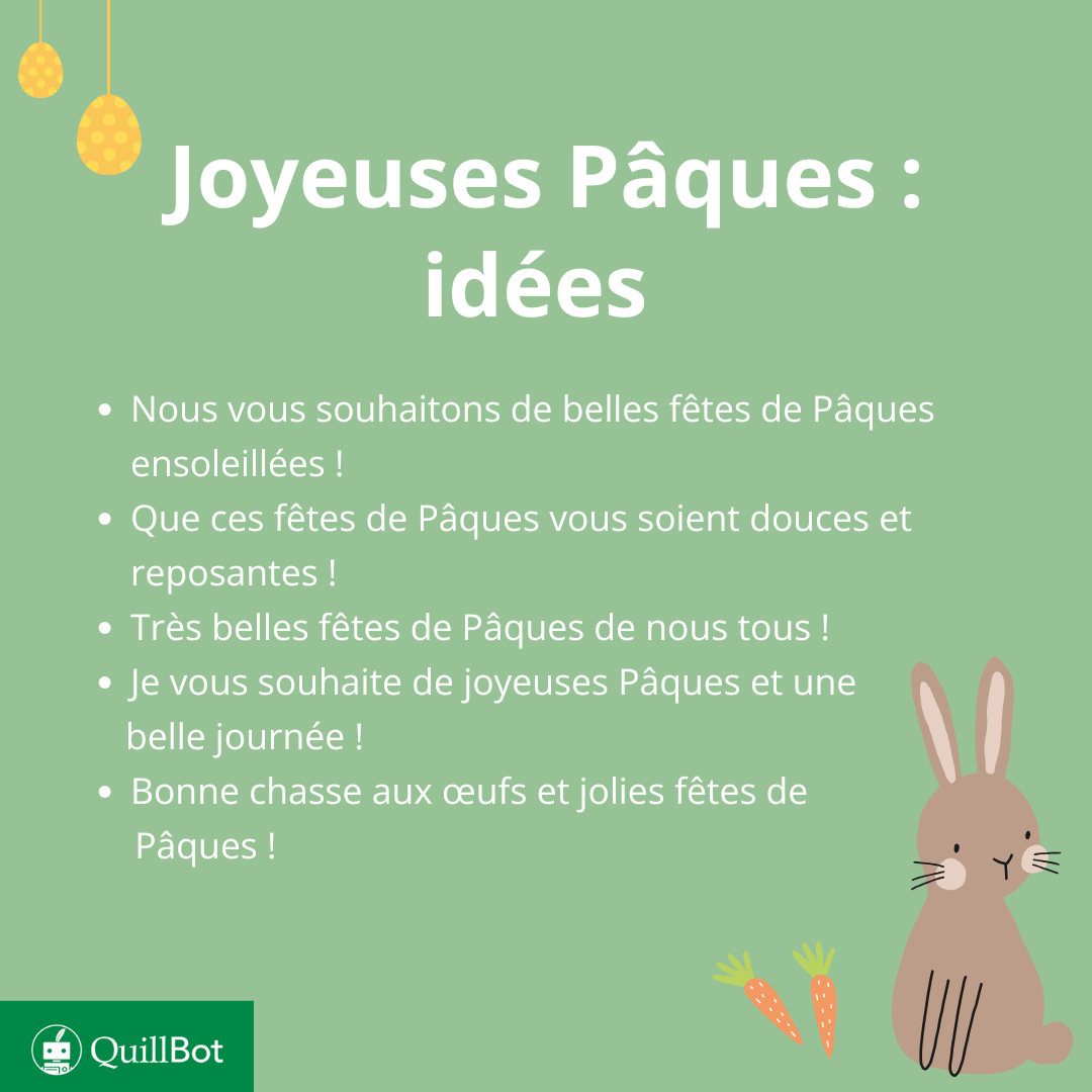 Le peton, M. (31 mars 2026). Cartes Joyeuses Pâques 2026 : 12 idées et messages. Quillbot. Date : 9 avril 2026, issu de l’article suivant : https://test.abubakkarahmad.com/fr/blog/souhaits-et-expressions/joyeuses-paques/